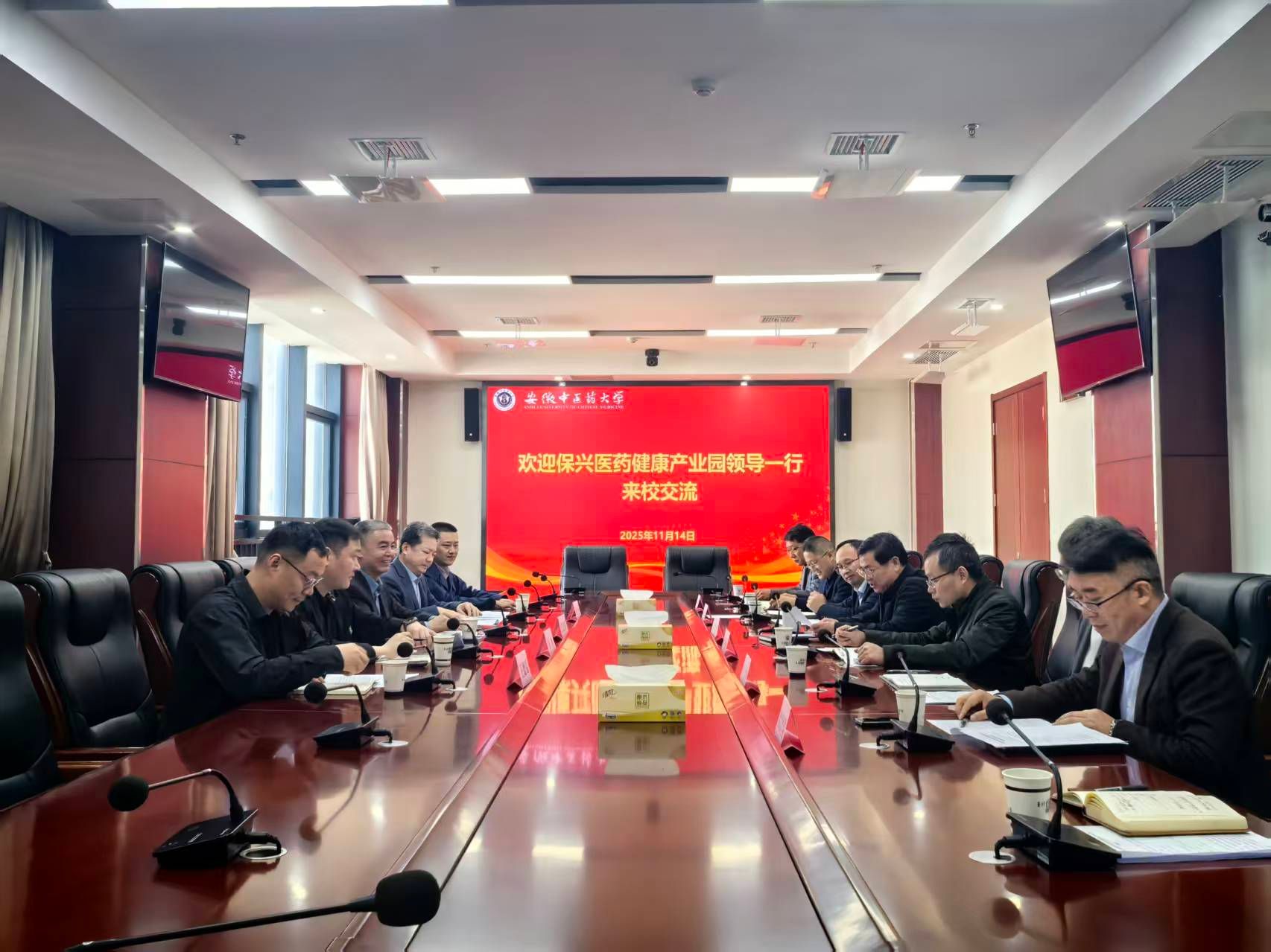 11月14日上午,保兴医药健康产业园董事长张建强等一行来访,校党委书记谢瑞瑾,教务处、科技处、社会合作处、医药经济管理学院、继续教育学院主要负责人参会。