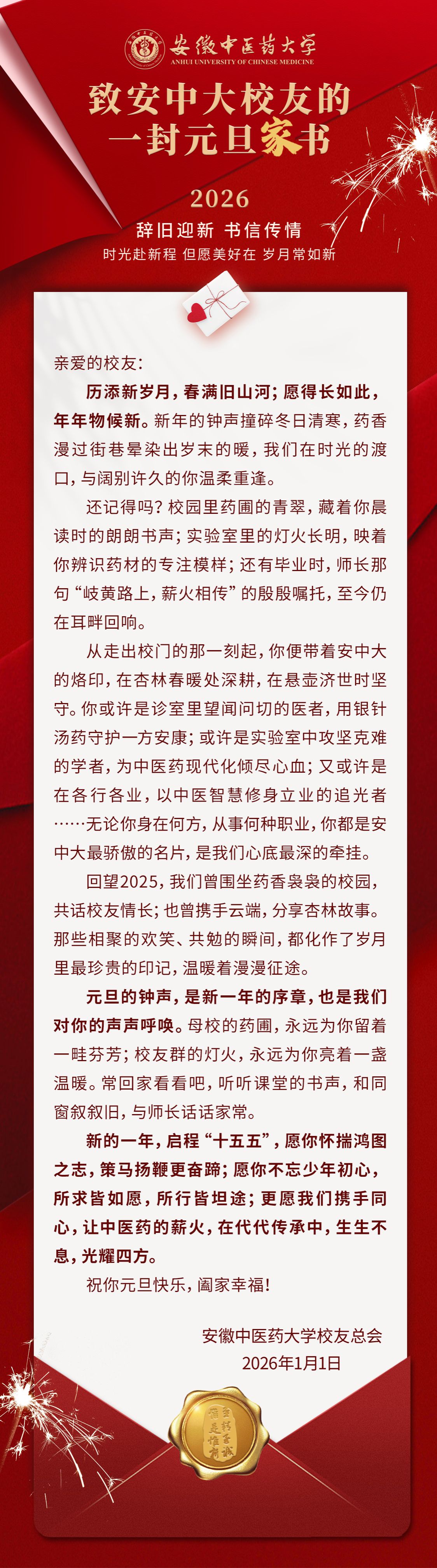 元旦的钟声,是新一年的序章,也是我们对你的声声呼唤。母校的药圃,永远为你留着一畦芬芳;校友群的灯火,永远为你亮着一盏温暖。常回家看看吧,听听课堂的书声,和同窗叙叙旧,与师长话话家常。