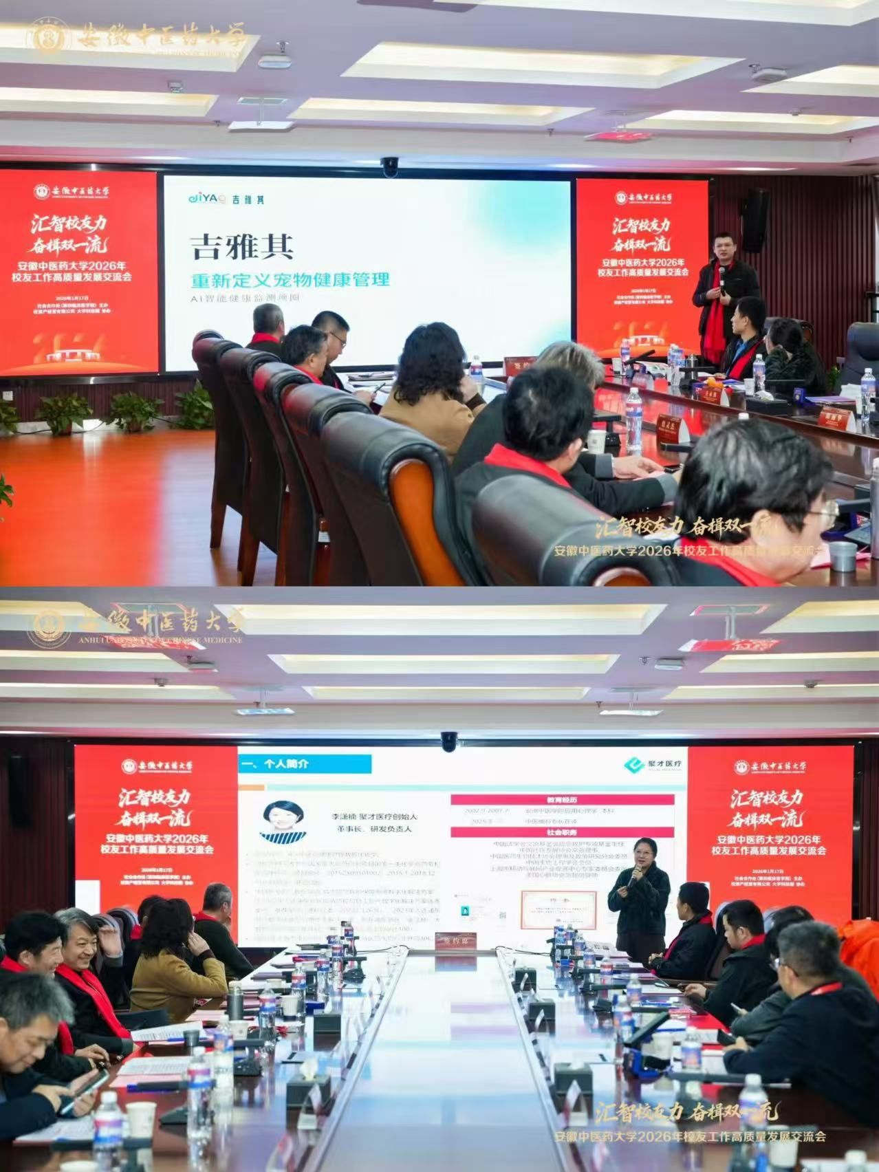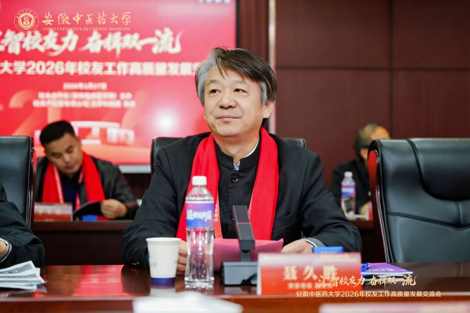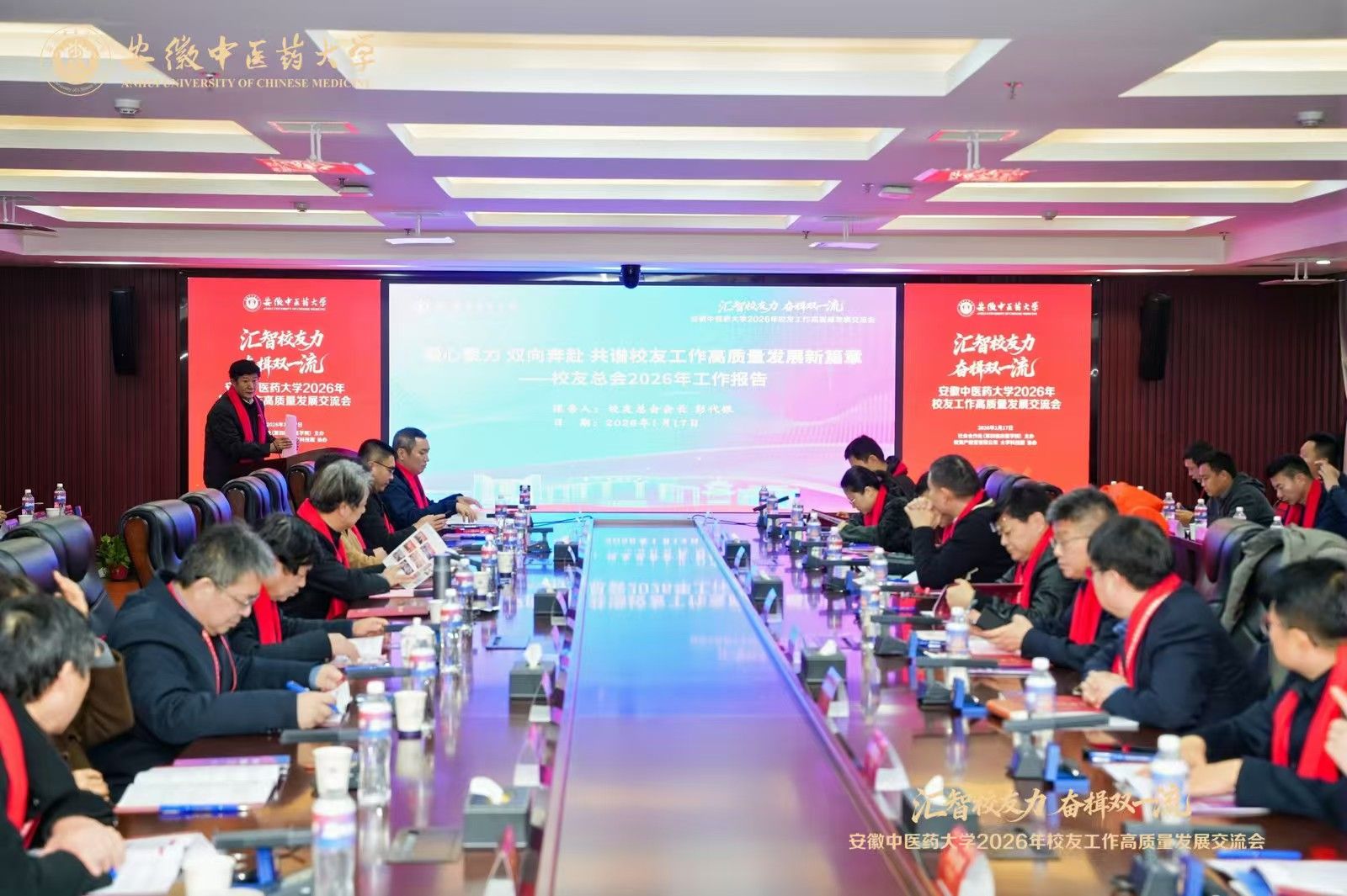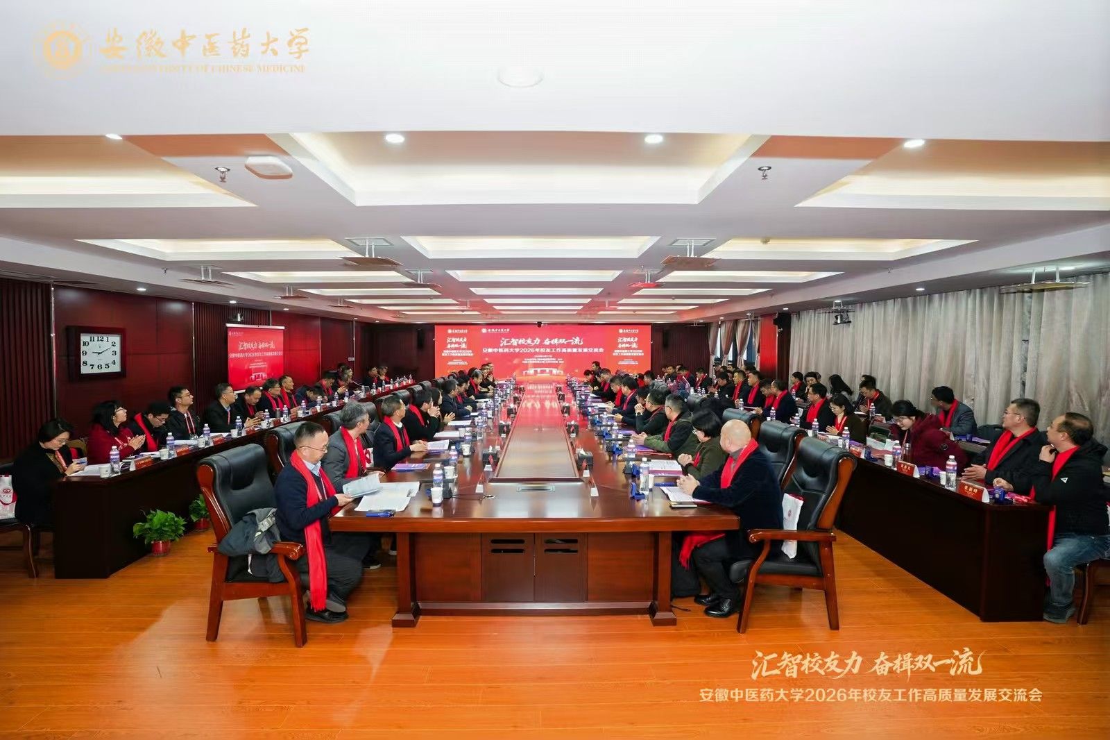 1月17日,安徽中医药大学2026年校友工作高质量发展交流会在校举行。校党委书记谢瑞瑾,校友总会会长彭代银,副校长魏骅、聂久胜、桂双英,纪委书记詹灵杰,党委常委董玉节,校教育发展基金会副理事长张永群、吴达武出席会议,来自北京、上海、广东、浙江、重庆、江苏等全国各地校友分会代表,青年校友企业家,以及学校相关职能部门、各学院负责人齐聚一堂,共同探讨校友工作高质量发展路径,汇智校友力、奋楫双一流。会议由聂久胜主持。