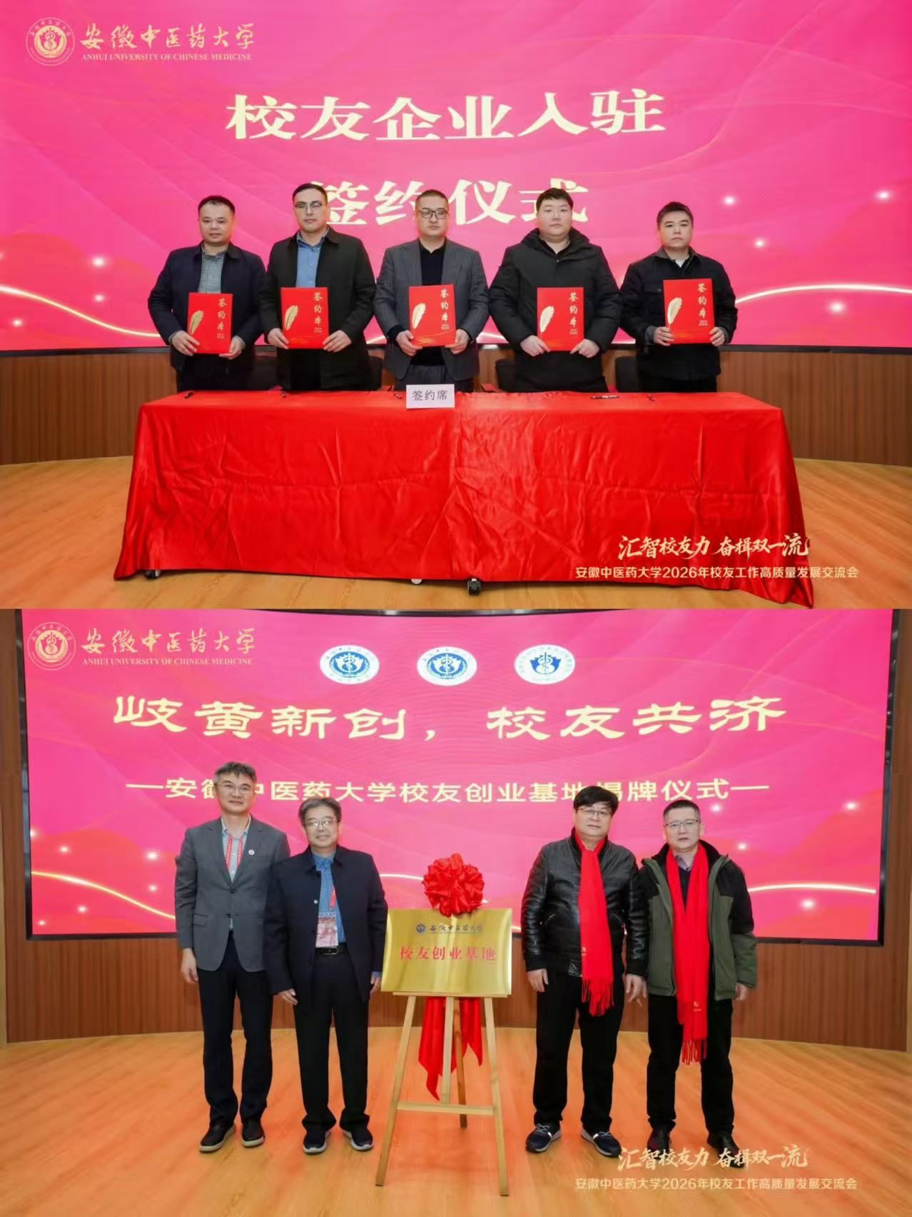 上海聚才医疗科技有限公司董事长李潇楠、安徽众至康医疗管理有限公司总经理李响,以及校友之家项目捐赠代表朱国伟,吕小松个人分别与学校教育发展基金会理事长彭代银签署捐赠协议。