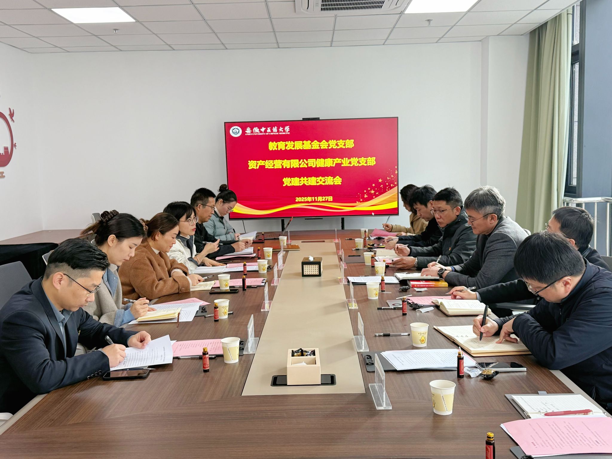 2025年11月27日,学校社会合作处教育发展基金会党支部与资产经营有限公司健康产业党支部开展党建共建交流,资产经营有限公司党委副书记、纪委书记王雅慧主持会议。