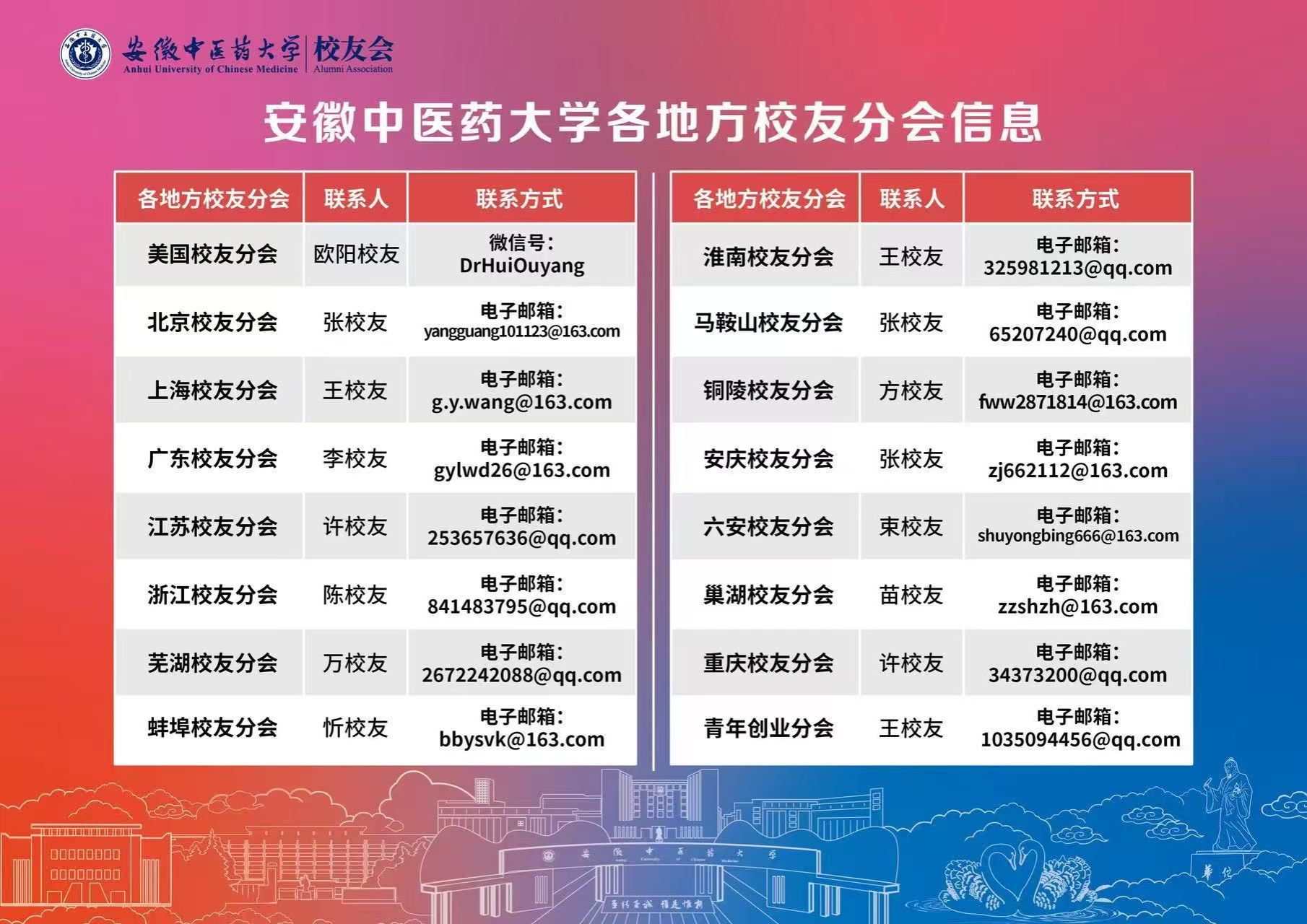 安徽中医药大学各地方校友分会信息